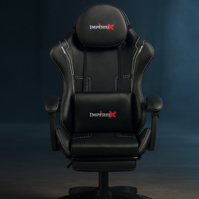 Silla Gamer Negra IMPERIUX + Tapizado en Carbono + Masajeador + Reposapies